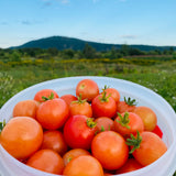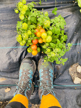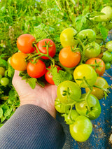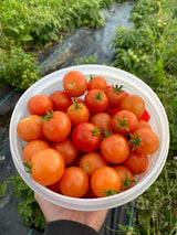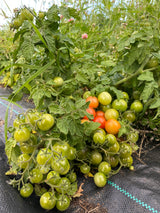Minuscule plant très robuste et compact (20-30 cm de haut x 30 cm de largeur). Parfait pour les petits espaces et la culture en pots. Tomate cerise de format 2,5-4 cm de diamètre, fermes, d'une couleur rouge orangée.