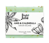 Ingrédients: Huiles saponifiées d'olive, de noix de coco, de ricin, de tournesol, de colza, beurres saponifiés de karité* et de cacao, eau, argile, poudre d'orcanette (plante), huile essentielle d'anis étoilée, pétales de calendulas.