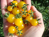 Très hâtive, elle arrive en même temps que les framboises ici au Bic. La plante produit de nombreuses grappes portant des dizaines de petites tomates cerises jaunes de la grosseur d’une groseille, sans défaut et d’excellente qualité. Besoin d’être tuteuré.