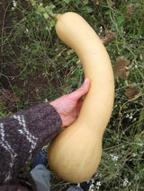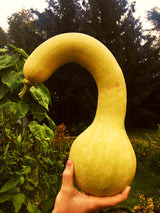 The 'Canada Crookneck' is a very old and very rare cultivar of butternut squash. All modern-day butternut cultivars originate from the Canada Crookneck. It has a superior taste and texture to conventional butternut squash. Its long, thing neck made it prone to breakages in conventional agriculture, and as such it has since ceased to be farmed commercially... to the detriment of flavour.
