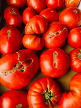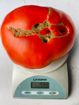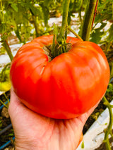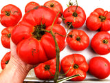 The Oscar Gonthier is a very large fleshy tomato with very few seeds and juice, with a texture somewhat resembling an Italian tomato. Excellent fresh, served thinly sliced on a plate with salt & pepper and a drizzle of oil. Equally good for sauces and preserves. Flattened to heart-shaped red fruit. Determinate plant.