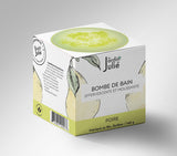 Fizzy and foaming pear bath bomb, coloured naturally and scented with certified organic natural fragrance.